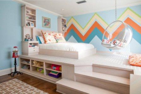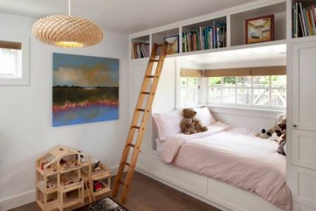 Сходи, які ведуть до верхнього ліжка, можуть служити зручною системою зберігання. Є два варіанти сценарію: перший – коли сходинки використовують як затишних ніш, другий – під сходами розташовані висувні ящики.