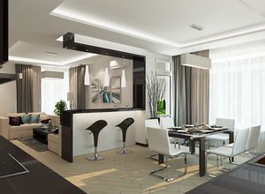 - З великими дверима чи без, Ви все ж вирішили зробити кухню-студію. Тепер необхідно на плані в масштабі вирішити принцип розташування меблів. Зверніть увагу на наступне: розташуйте телевізор у вітальні так, щоб в ньому не відзеркалювалось вікно, найкраще так, щоб його можна було дивитись і з кухні; якщо Ви відмовились від передпокою, як окремої кімнати, зробіть його не прохідною зоною. Щоб, ідучи на кухню, Вам не прийшлось ходити по відносно брудній плитці. Один з варіантів розташування меблів – це дизайн кухні з барною стійкою, яка може слугувати зонуючим елементом між кухнею і вітальнею.